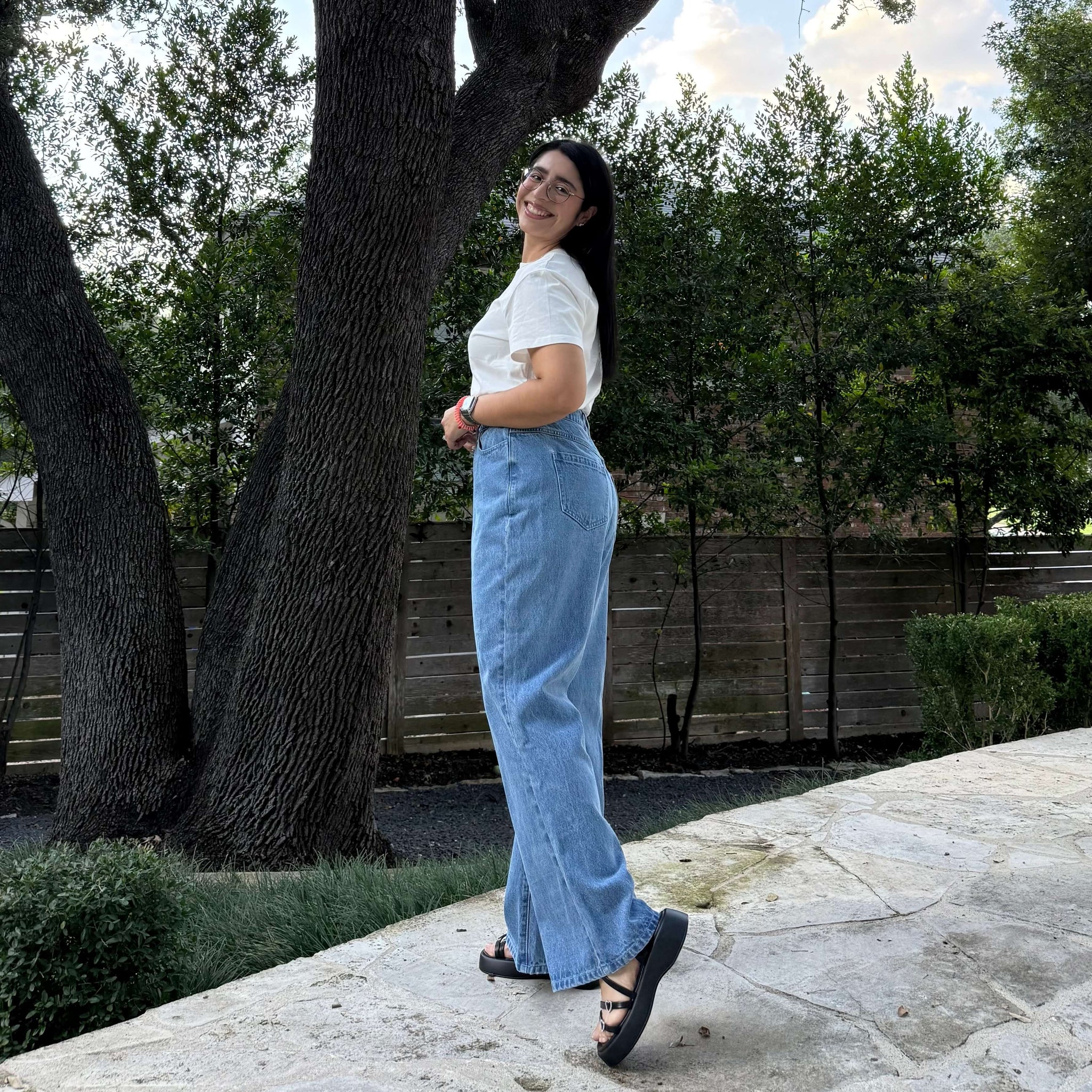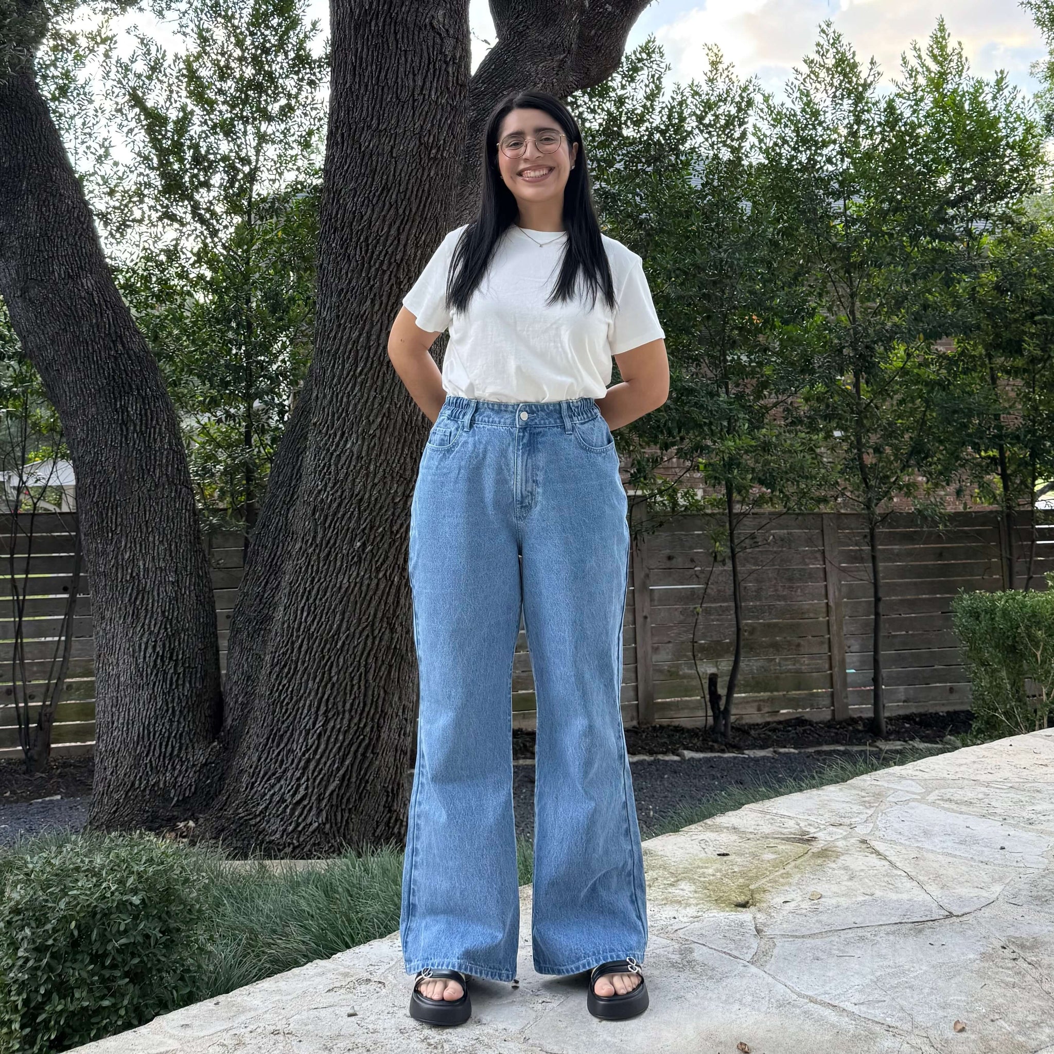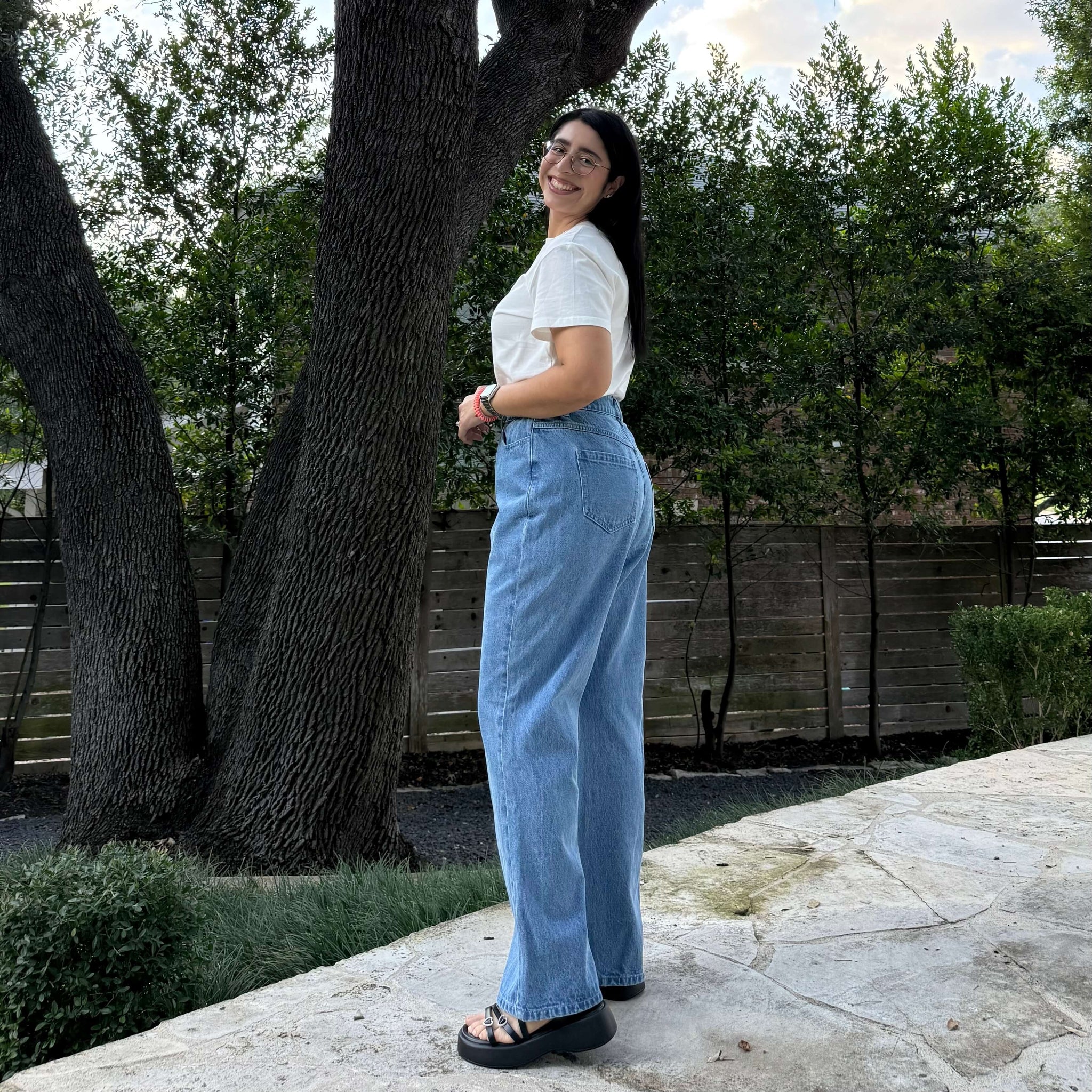 The jeans are meant to be fitted at the waist and a bit loose around the legs.
