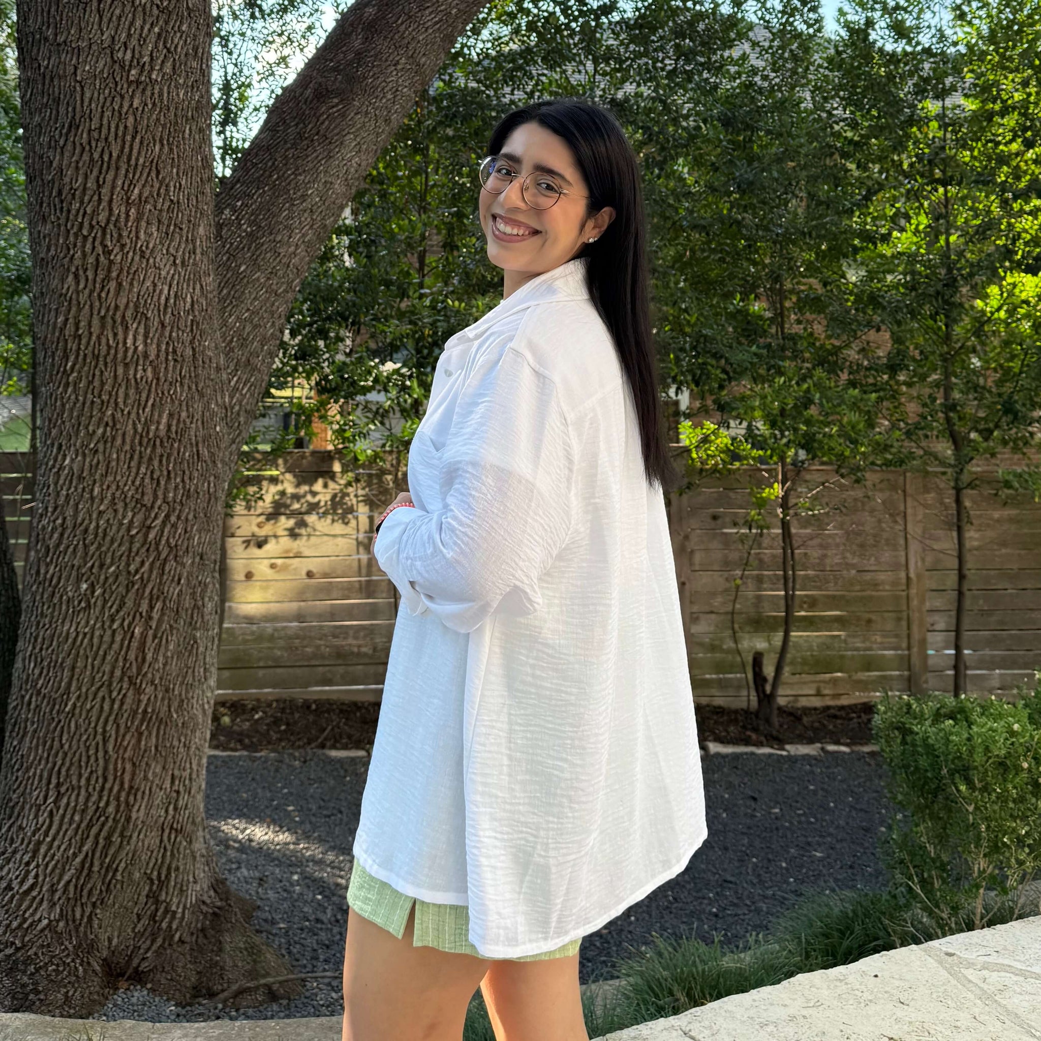We recommend following your bust measurement to determine size. This button-up is meant to be slightly fitted at the bust & slightly loose around the hips :)